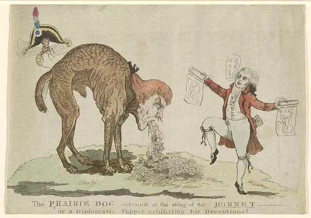 James Akin. 1804. "The prairie dog sickened at the sting of the hornet or a diplomatic puppet exhibiting his deceptions." Etching with Watercolor. Library of Congress Prints and Photographs Division Washington, D.C. 20540.