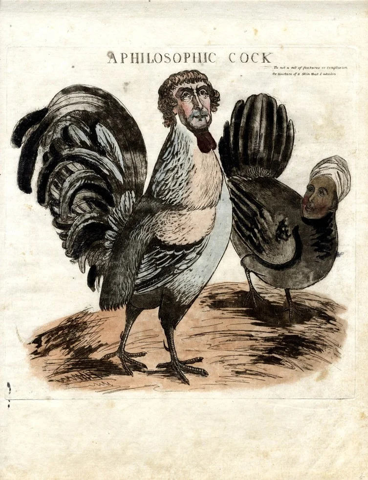 James Akin. 1804. "A Philosophic Cock." Hand-colored Engraving with Aquatint. From the Charles Peirce Collection of the American Antiquity Society. Accessed: May 22, 2016. http://www.americanantiquarian.org/Inventories/Peirce/f1.htm