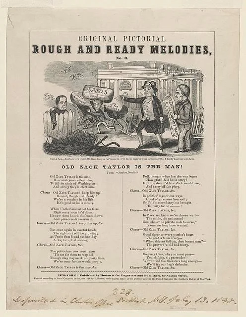 Tudor Horton. 1848. "Original Pictorial: Rough and Ready Melodies. No. 3, Old Zack Taylor is the Man!" T. Horton & Co. Engravers and Publishers. Wood Engraving with Letterpress. Library of Congress Prints and Photographs Division Washington, D.C. 20540