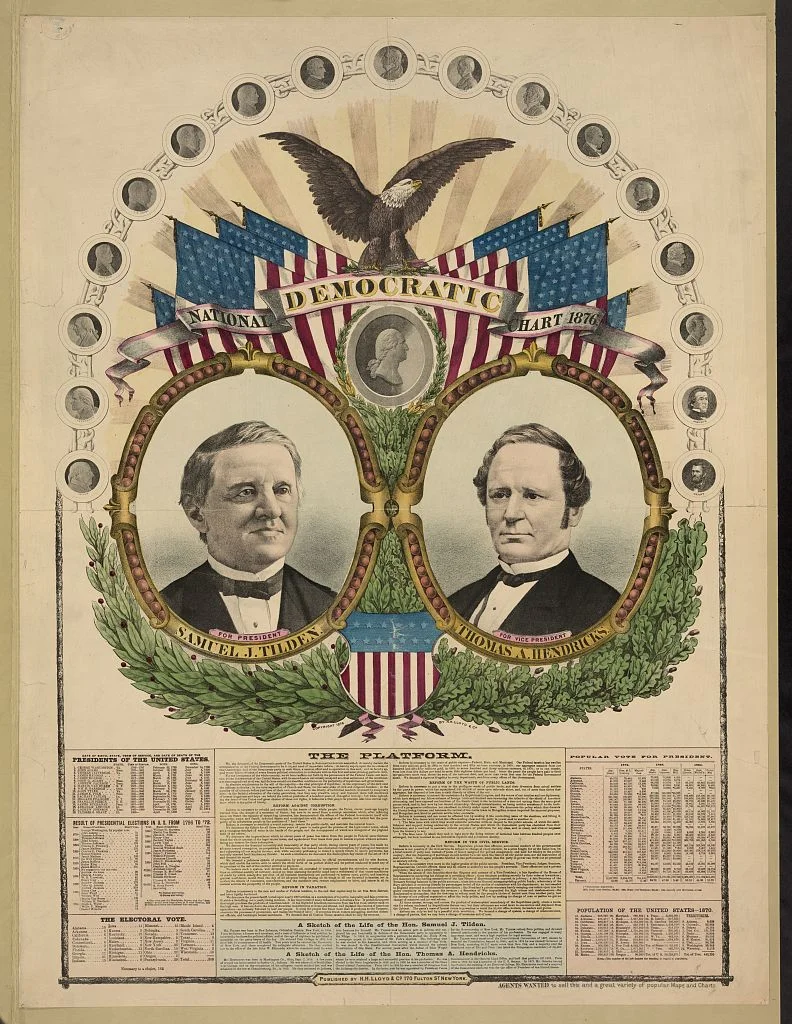 Anonymous. 1876. "National Democratic Chart, 1876: For President, Samuel J. Tilden, for Vice-President, Thomas A. Hendricks." H.H. Lloyd & Co. Lithograph with Letterpress. Library of Congress Prints and Photographs Division Washington, D.C. 20540.