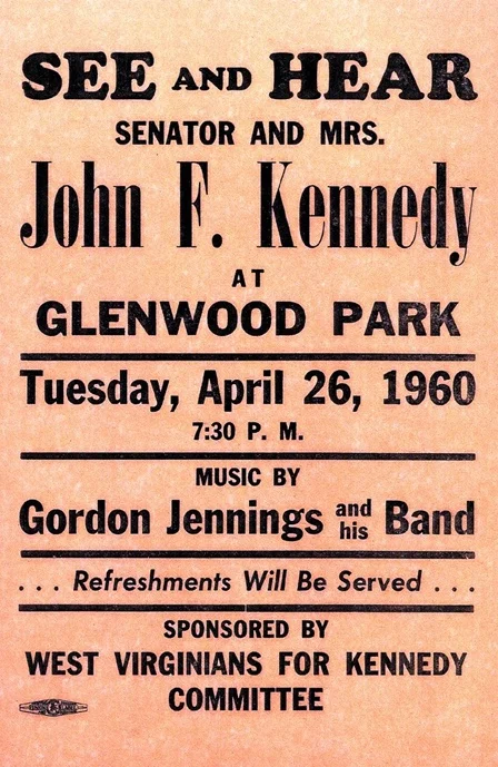 Anonymous. 1960. "See and Hear Senator and Mrs. John F. Kennedy at Glenwood Park" West Virginians for Kennedy Committee. From the John F. Kennedy Presidential Library and Museum. Accessed: May 24, 2016. http://www.jfklibrary.org/Asset-Viewer/3TzyiVV4t0a9q-iVgyidAg.aspx
