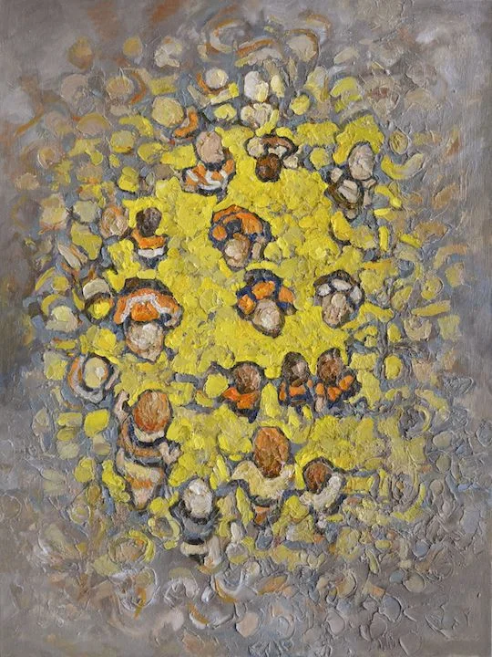 The themes of my work originate from imaginary worlds of gathering people, ants, and memories of landscapes. From a vantage point that looks down, I use the abstractions of people clusters as means to both an imaginary fiction and as reliable design modules to lend structure and unity. I experiment with the ambiguity between figure and ground, color schemes, tactile surfaces, and different sequences of gestures that create rhythm and asymmetrical balance.