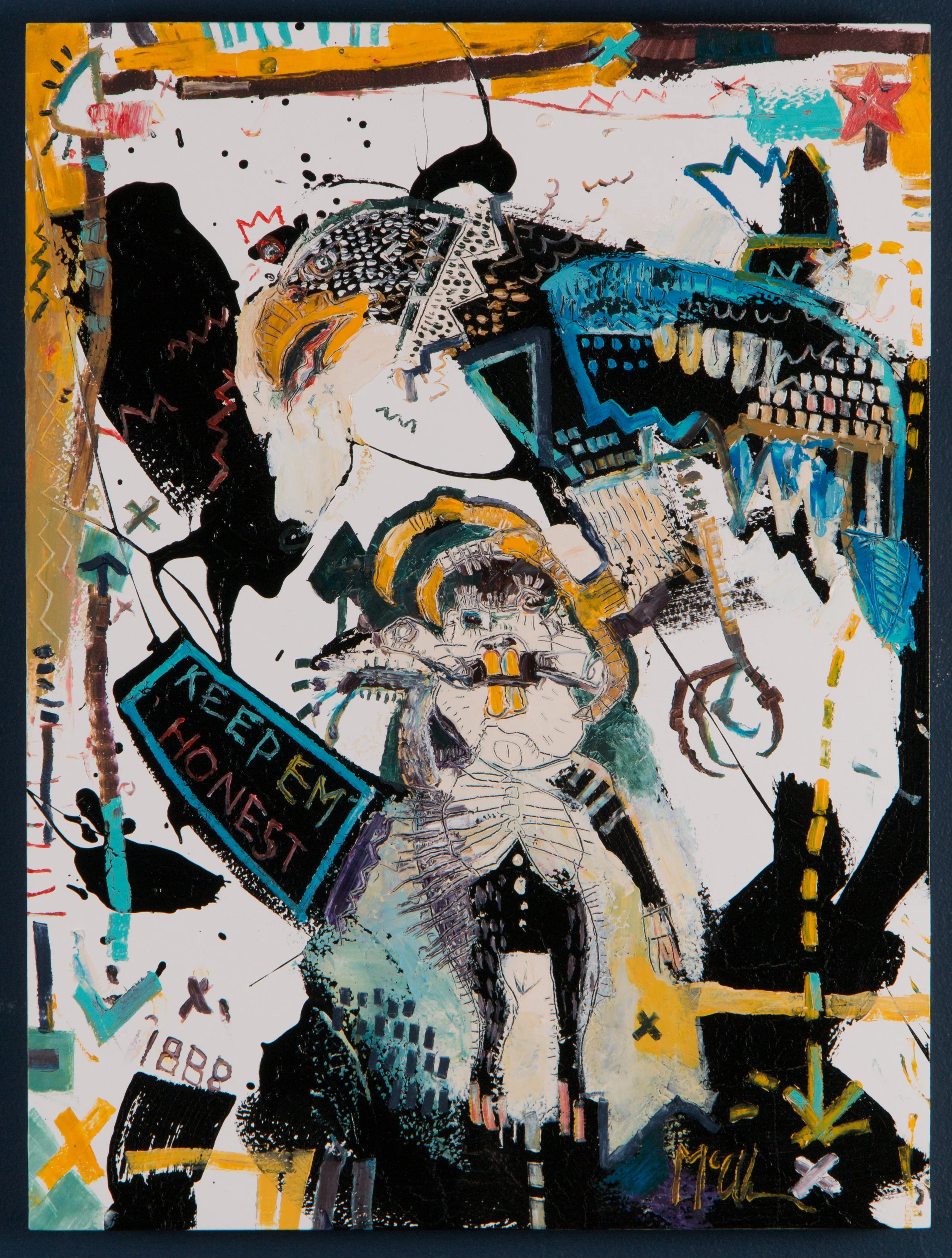Daniel’s paintings are process focused and examine the connectivity of instinct, impulsive action, and identity. The work begins non-objectively in the form of a chaotic black and white abstract painting, and from there the animal— a central figure in all his works—emerges. These animals, created from a variety of colors, patterns, textures, forms, and symbols, take on the role of both a totem as well as the embodiment of instinct itself.